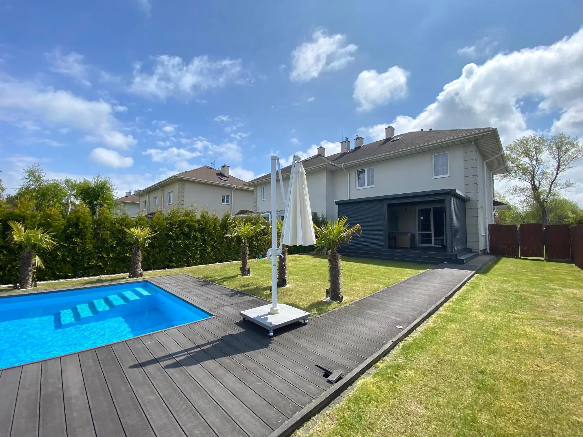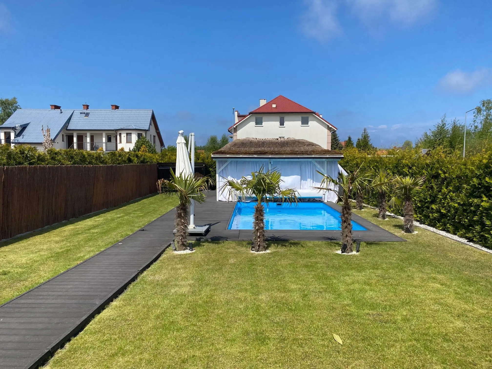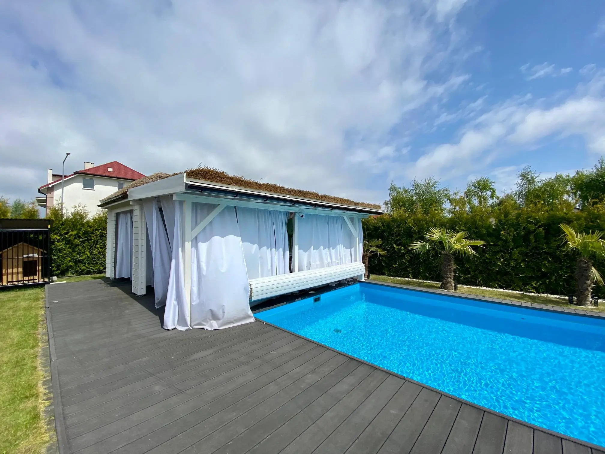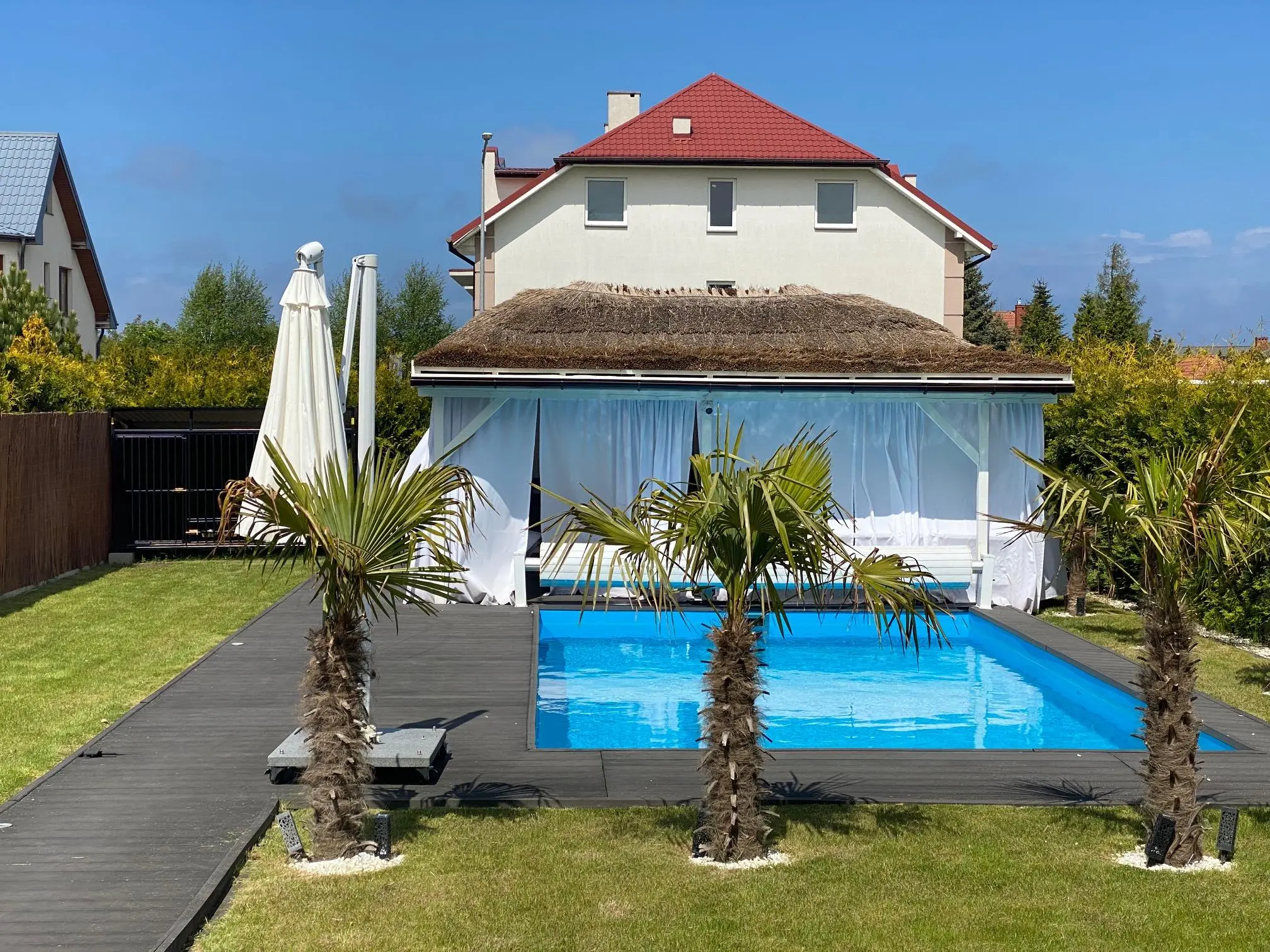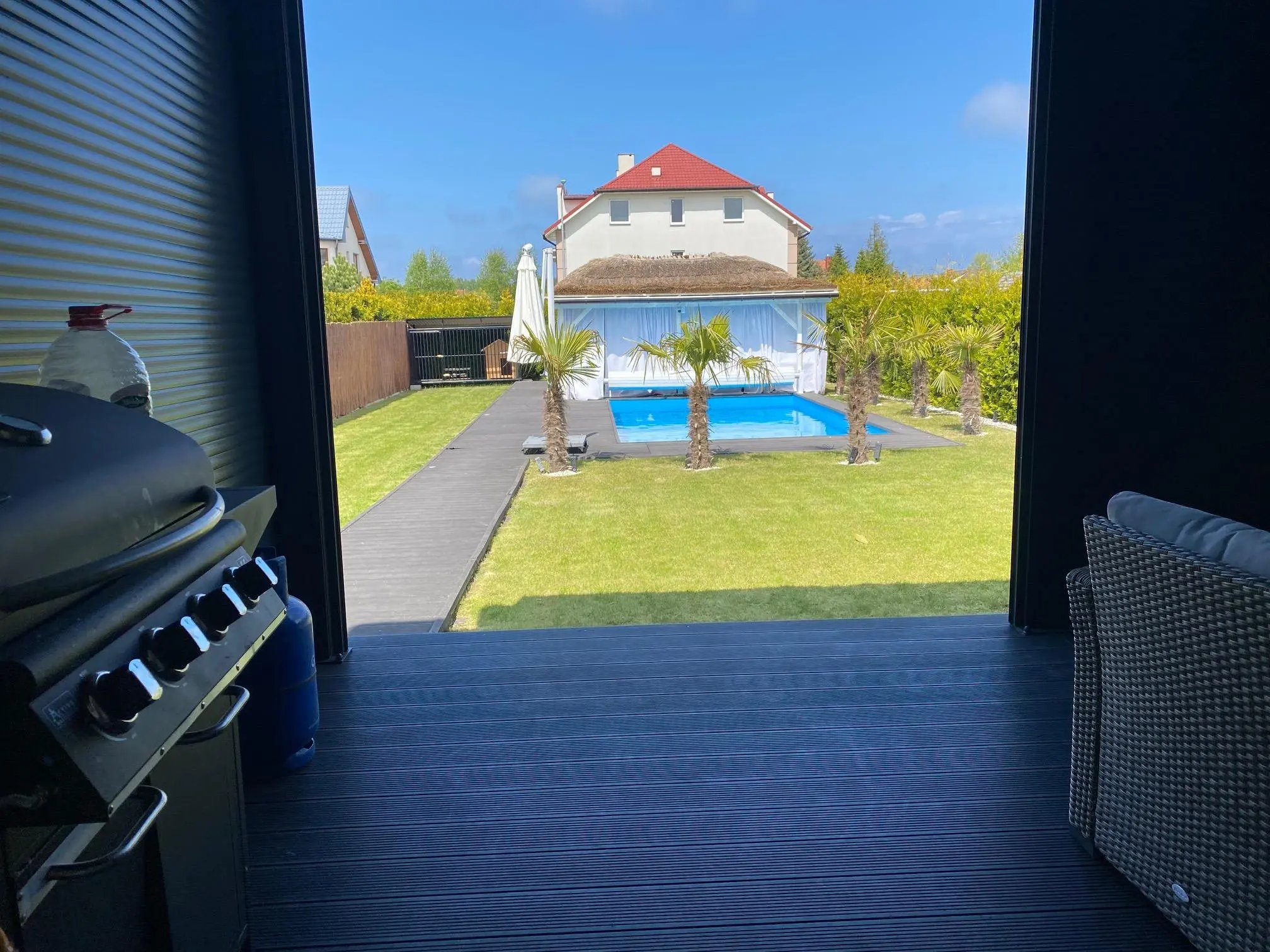 - pokój dzienny, jadalnia z wyjściem na taras i ogród z pięknym basenem zewnętrznym oraz altaną. Starannie wykończony deską tarasową, wyposażony w leżanki oraz meble ogrodowe.