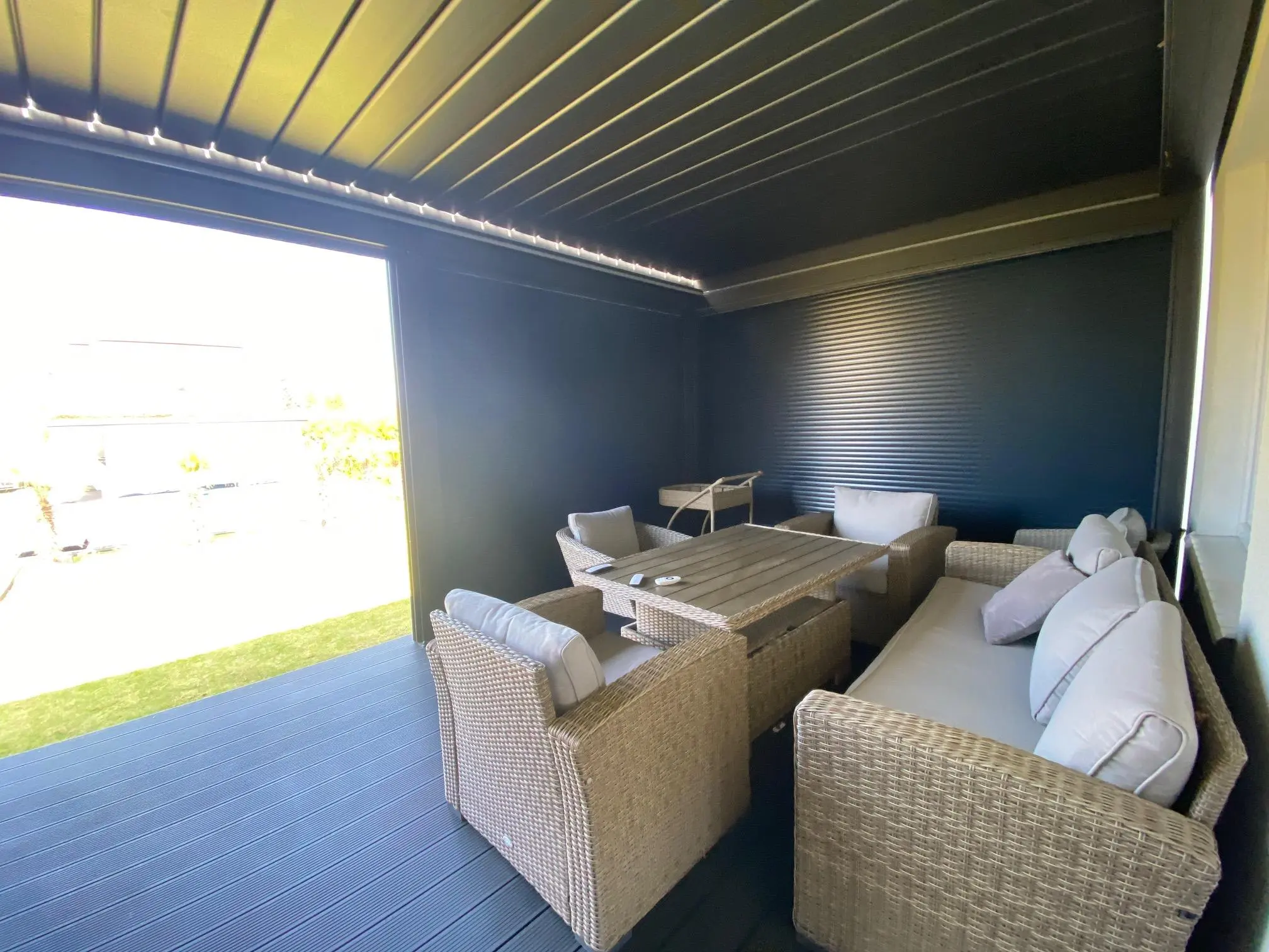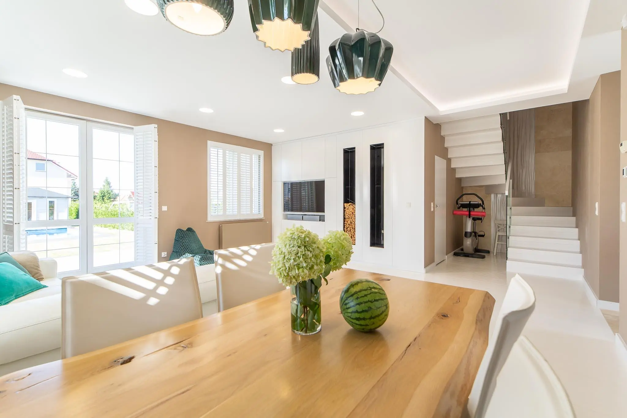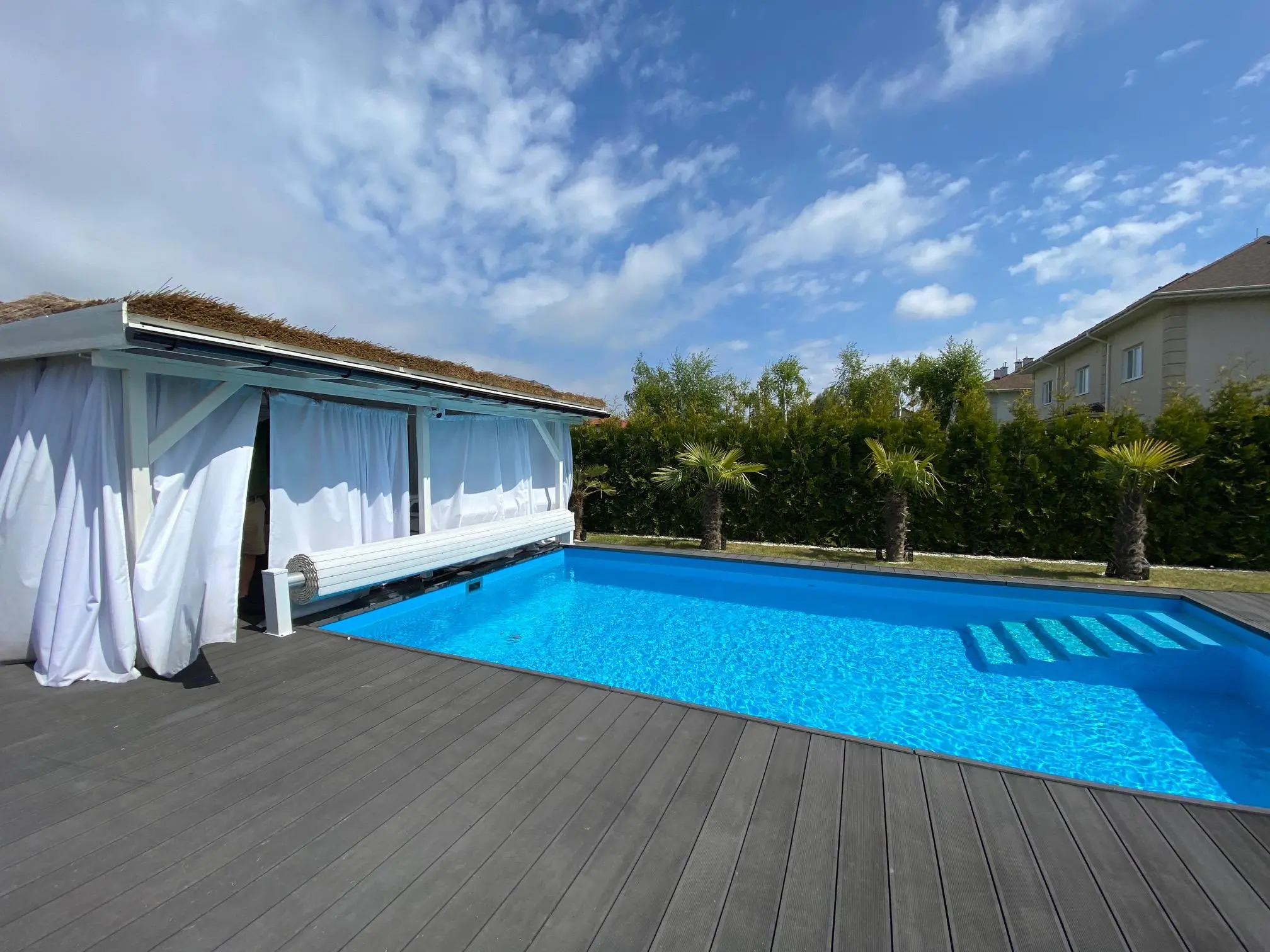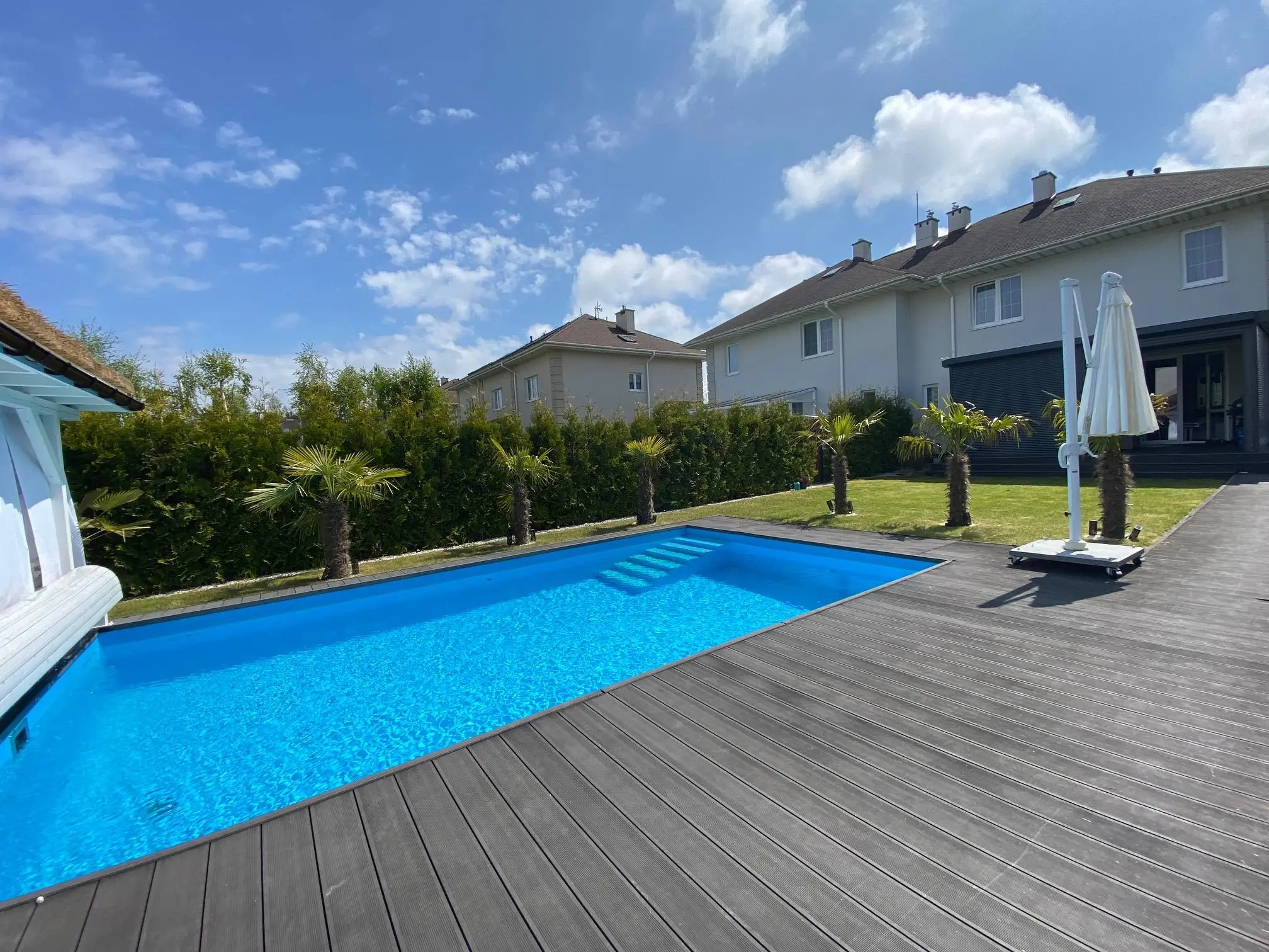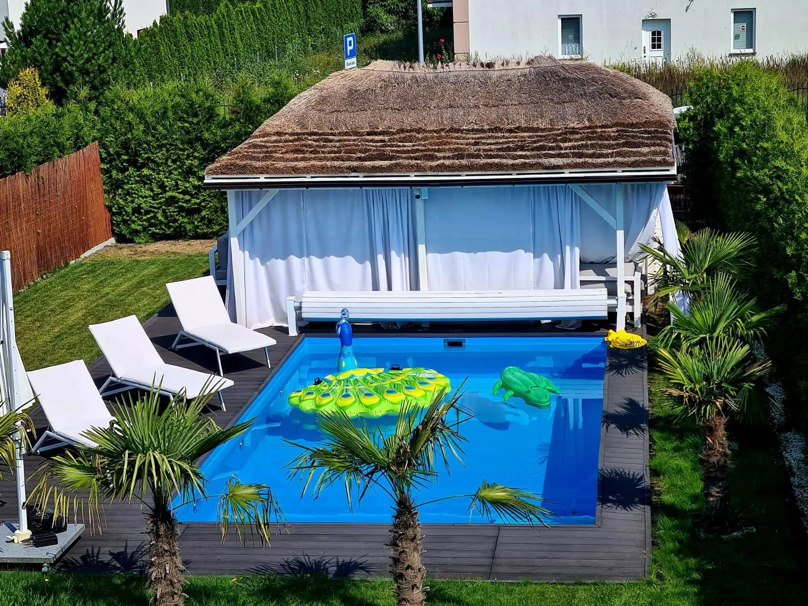 - pokój dzienny, jadalnia z wyjściem na taras i ogród z pięknym basenem zewnętrznym oraz altaną. Starannie wykończony deską tarasową, wyposażony w leżanki oraz meble ogrodowe.