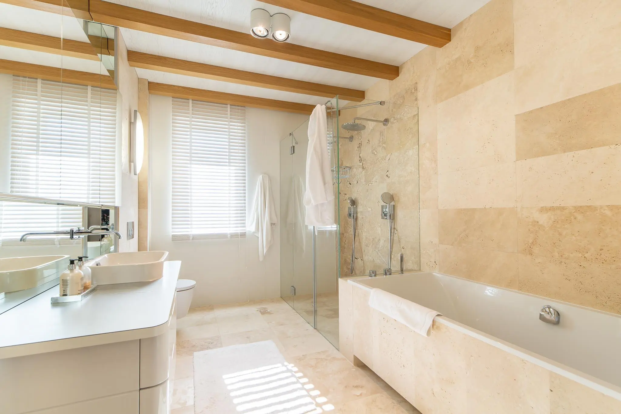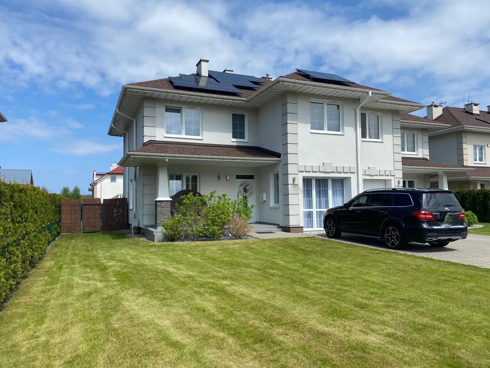 Na podłogach wysokiej klasy deska podłogowa, kamień naturalny oraz unikatowe wykładziny. Ogrzewanie podłogowe, dwie funkcjonale łazienki na każdym z pięter (jedna z natryskiem druga z wanną oraz natryskiem). Stylowe oraz klimatyczne oświetlenie. Płaskie telewizory w pokojach. Drzwi wewnętrzne pełne w kolorze białym, zewnętrzne antywłamaniowe ze szklanymi wstawkami.