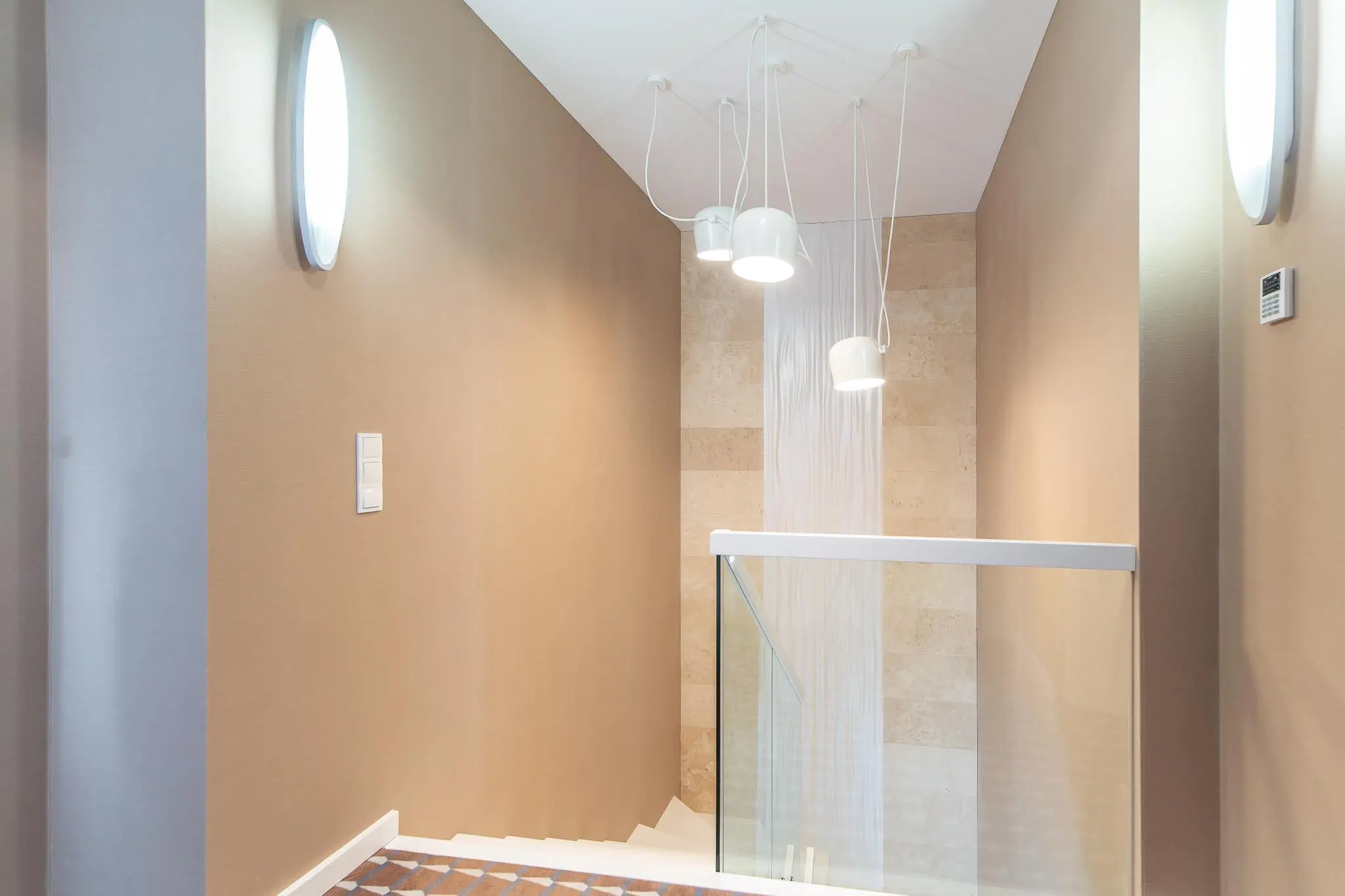 - dębowe schody wykonane na wymiar wraz ze szklaną balustradą.