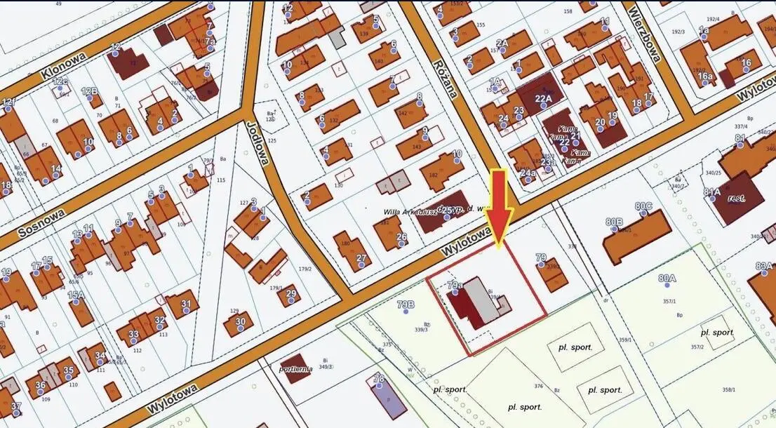 - Działka zabudowana budynkiem handlowo-usługowym, murowanym, parterowym o pow. 380 m2.